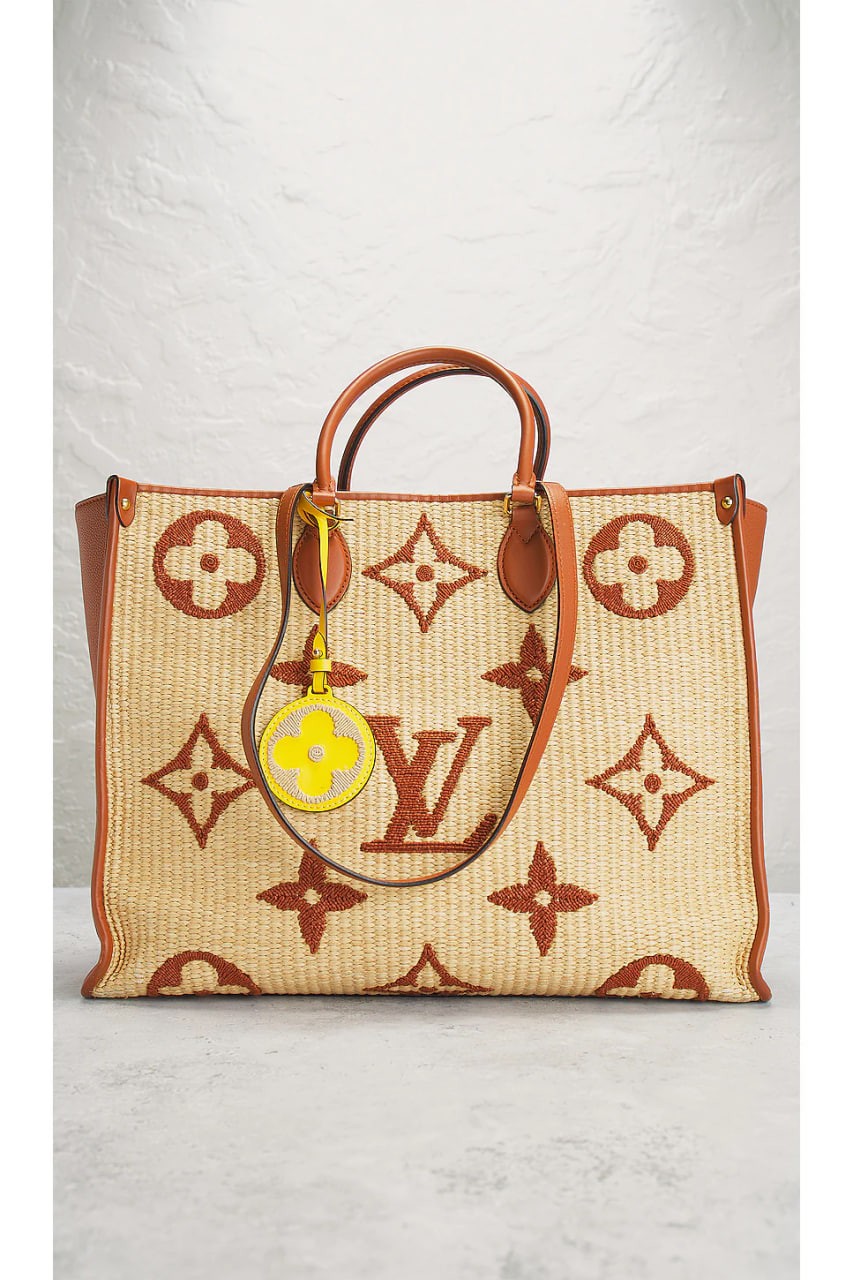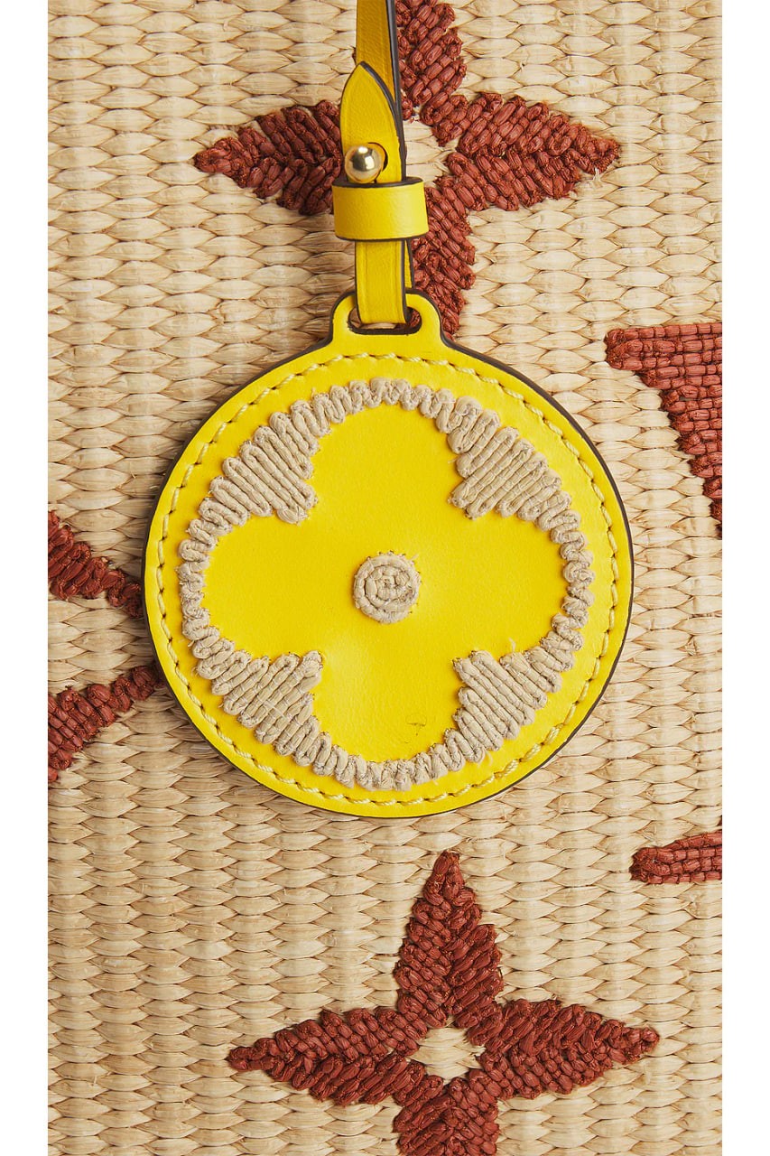 Monogram raffia with striped textile lining, leather trim and gold-tone hardware